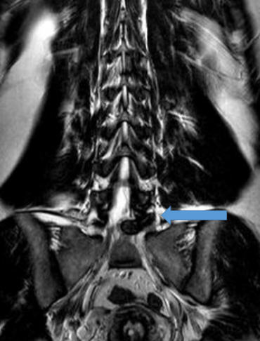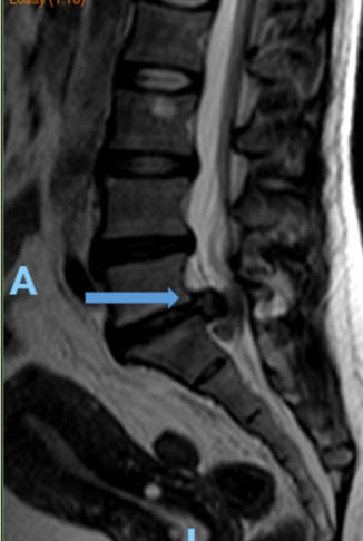 Hernia de disco lumbar extrusa L5 S1 (cortes sagital y coronal en resonancia magnética)