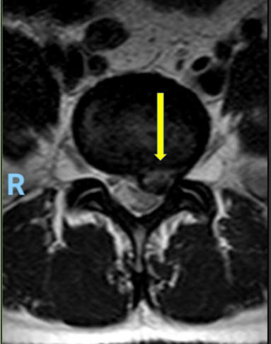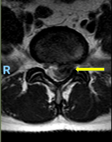 Hernia de disco lumbar extrusa L5 S1 (cortes axiales mostrando gran compresión sobre la raíz nerviosa izquierda del segmento)