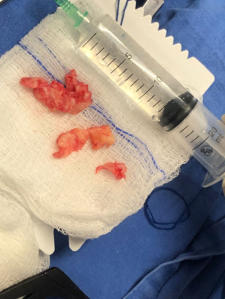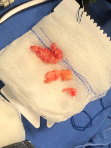 Fragmentos de disco lumbar removidos para la descompresión de la raíz nerviosa comparados con una gasa de 10 por 10 cm